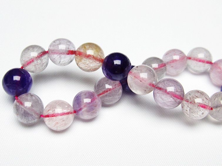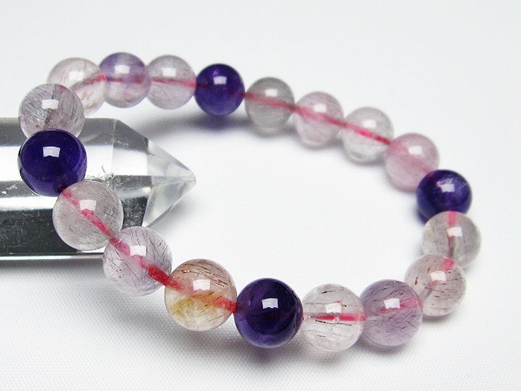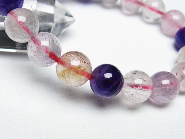 セイクリッドセブンは水晶・アメジスト・カコクセナイト・ゲーサイト・スモーキークォーツ・ルチル・レビドクロサイトの7つの鉱物を内包した天然石です。