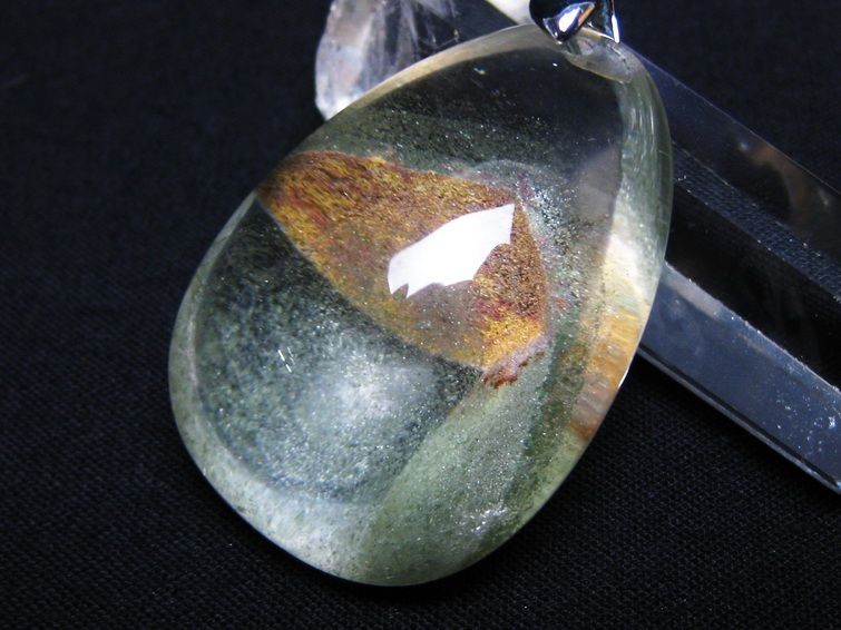 水晶の結晶が生成していく過程でいったん成長が止まり、その後再び成長を開始すると、その境目に気泡や他の物質が取り込まれ、まるで山の影を思わせる模様ができます。時にはそうした山の影が幾層にも連なっる場合があります。こうしてできた石を、ファントム水晶と呼びます。和名では、[幻影水晶][幽霊水晶]と称される場合もあります。