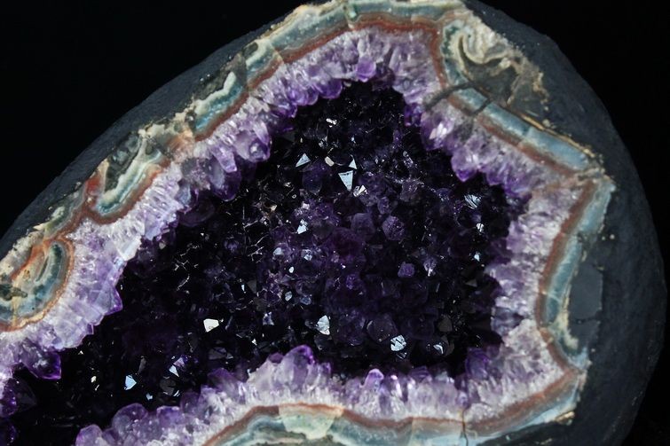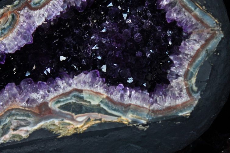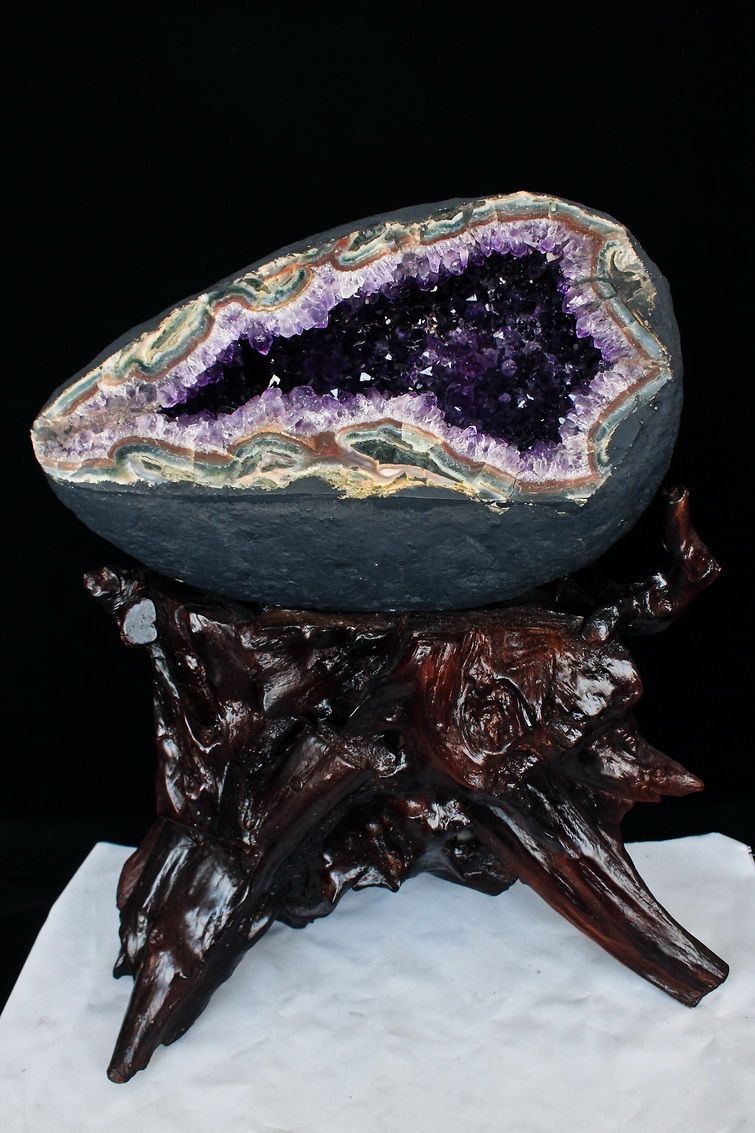 水晶は通常岩石の上に生成されますが、地層や岩の内側に洞窟状にできたものをアメジストドームといいます。アメジストの原石を半分に割り断面を美しく研磨すると、迫力と存在感、そしてエネルギーに満ちた置物に仕上がるのです。