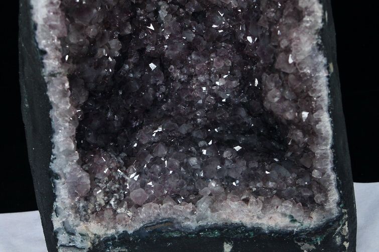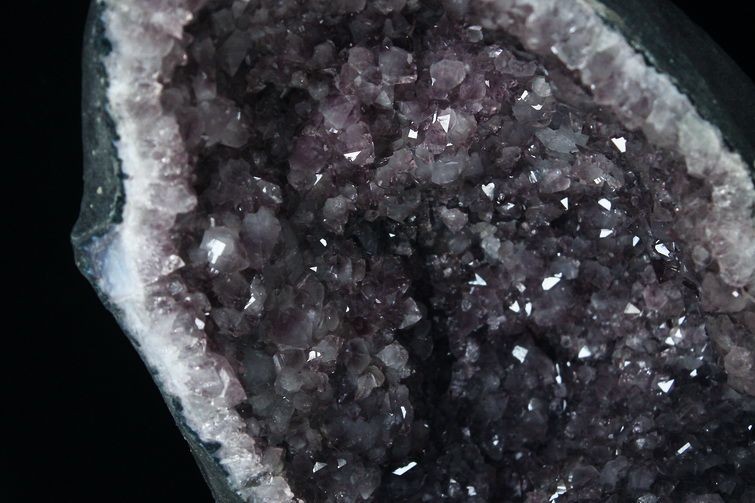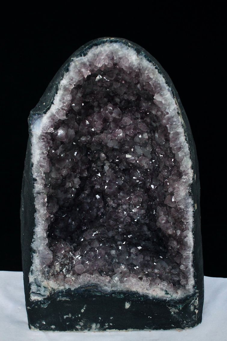 水晶は通常岩石の上に生成されますが、地層や岩の内側に洞窟状にできたものをアメジストドームといいます。アメジストの原石を半分に割り断面を美しく研磨すると、迫力と存在感、そしてエネルギーに満ちた置物に仕上がるのです。