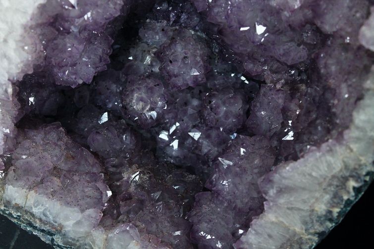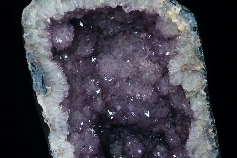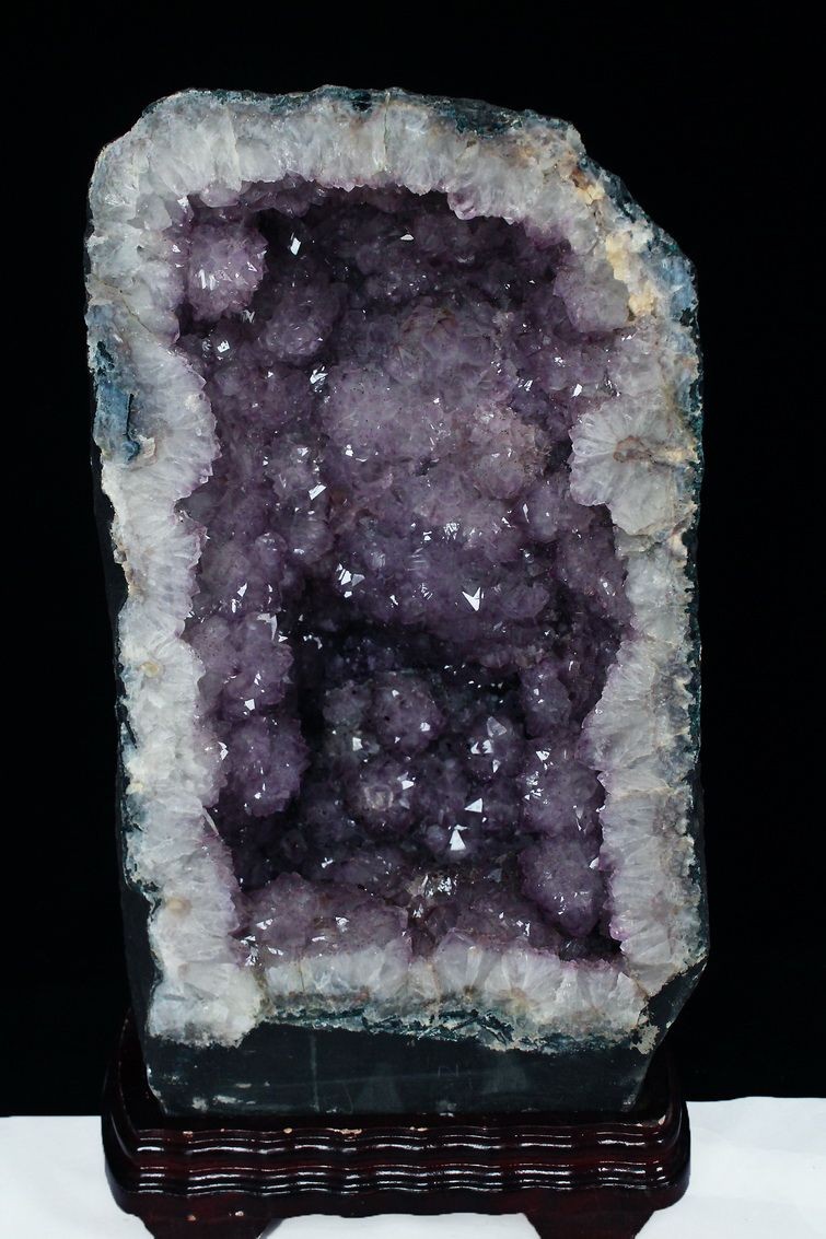 水晶は通常岩石の上に生成されますが、地層や岩の内側に洞窟状にできたものをアメジストドームといいます。アメジストの原石を半分に割り断面を美しく研磨すると、迫力と存在感、そしてエネルギーに満ちた置物に仕上がるのです。
