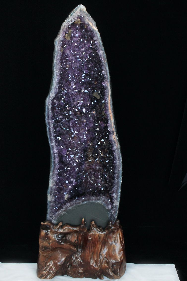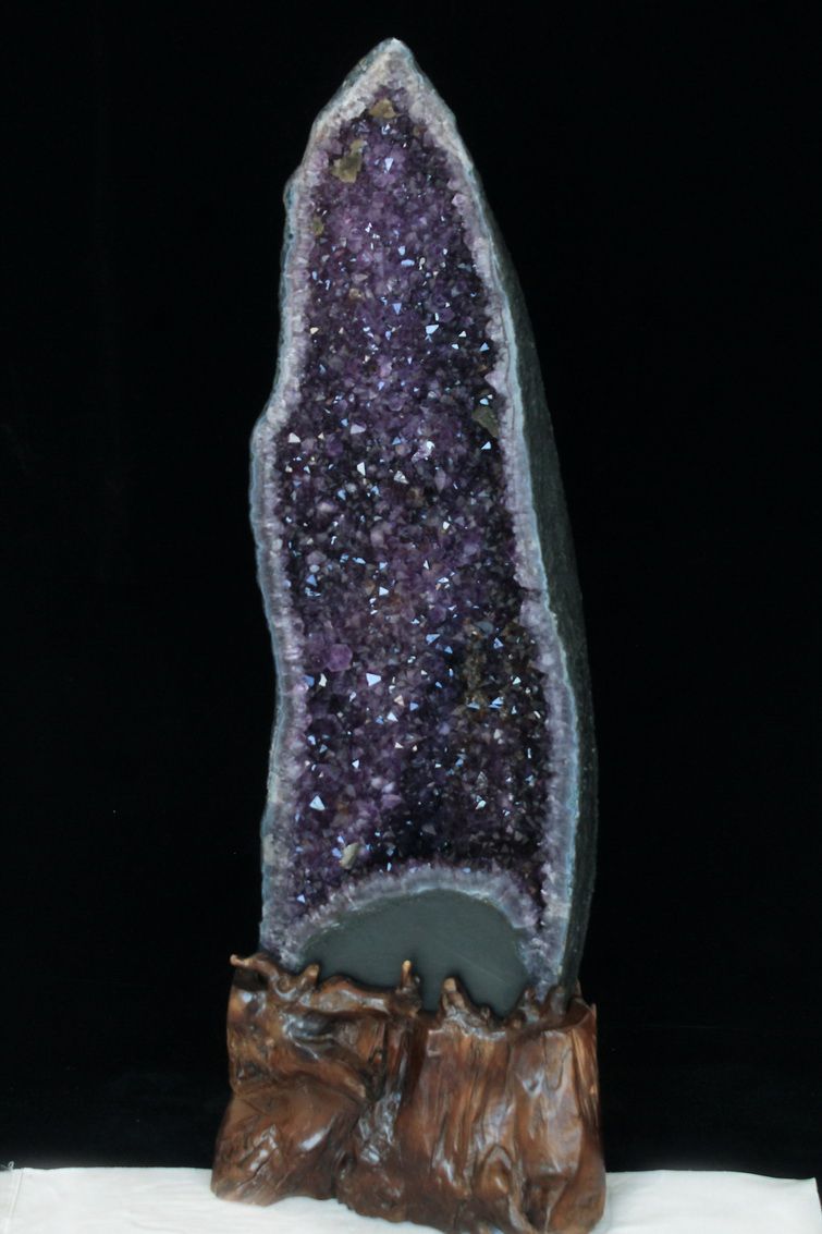 水晶は通常岩石の上に生成されますが、地層や岩の内側に洞窟状にできたものをアメジストドームといいます。アメジストの原石を半分に割り断面を美しく研磨すると、迫力と存在感、そしてエネルギーに満ちた置物に仕上がるのです。