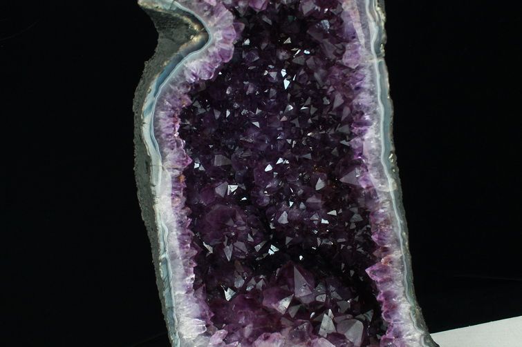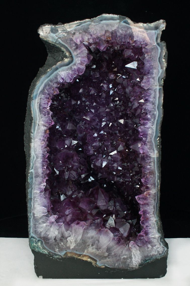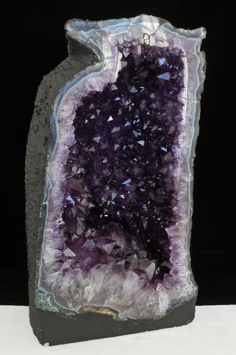 水晶は通常岩石の上に生成されますが、地層や岩の内側に洞窟状にできたものをアメジストドームといいます。アメジストの原石を半分に割り断面を美しく研磨すると、迫力と存在感、そしてエネルギーに満ちた置物に仕上がるのです。