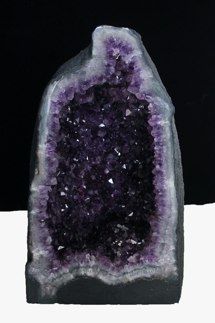 水晶は通常岩石の上に生成されますが、地層や岩の内側に洞窟状にできたものをアメジストドームといいます。アメジストの原石を半分に割り断面を美しく研磨すると、迫力と存在感、そしてエネルギーに満ちた置物に仕上がるのです。