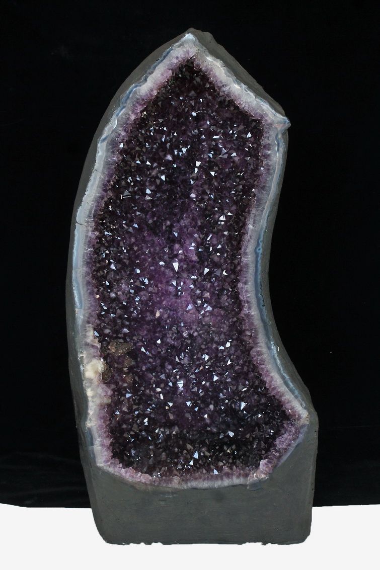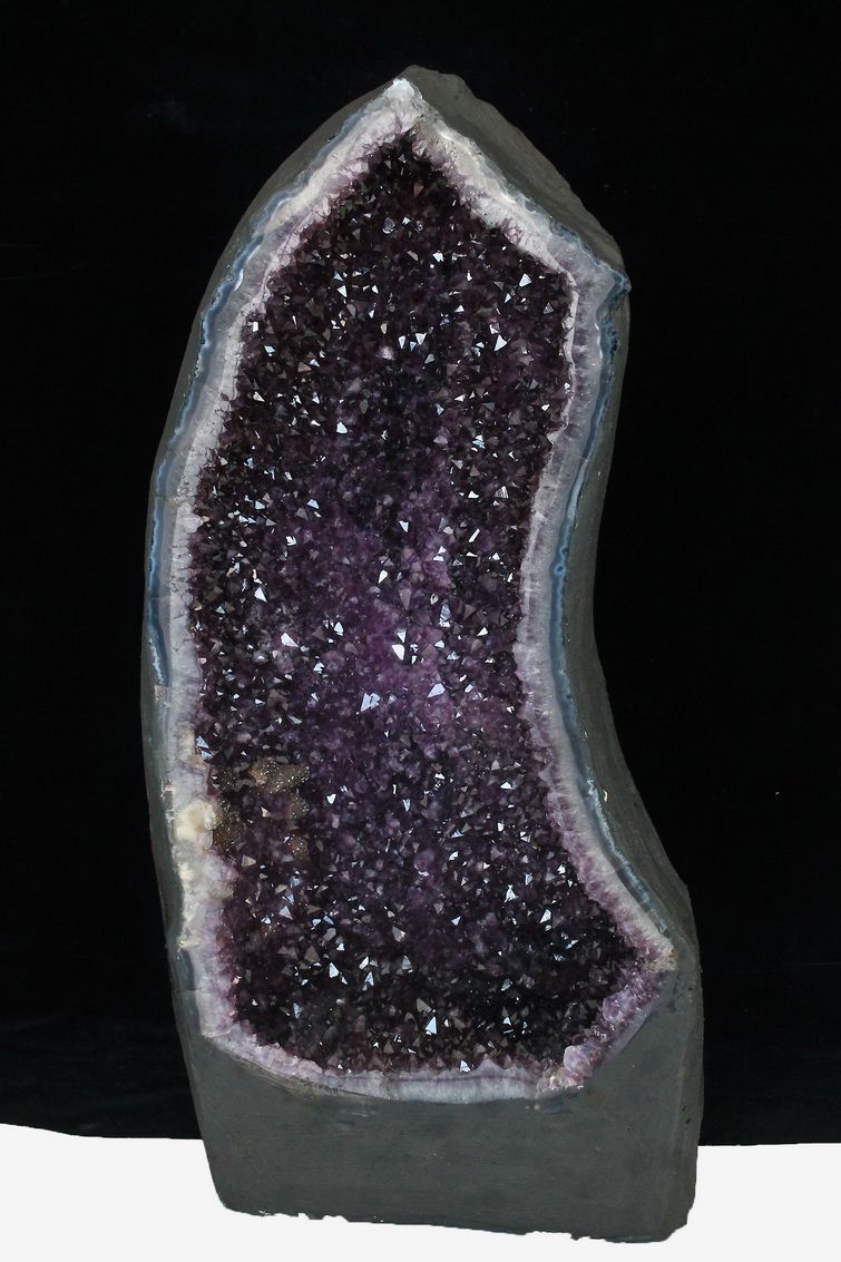 水晶は通常岩石の上に生成されますが、地層や岩の内側に洞窟状にできたものをアメジストドームといいます。アメジストの原石を半分に割り断面を美しく研磨すると、迫力と存在感、そしてエネルギーに満ちた置物に仕上がるのです。