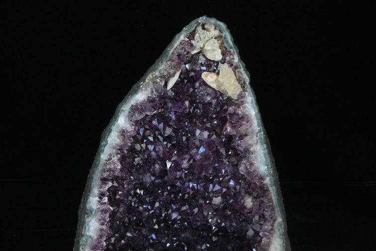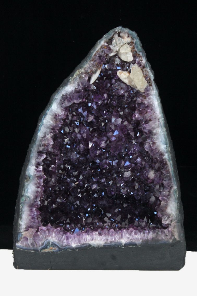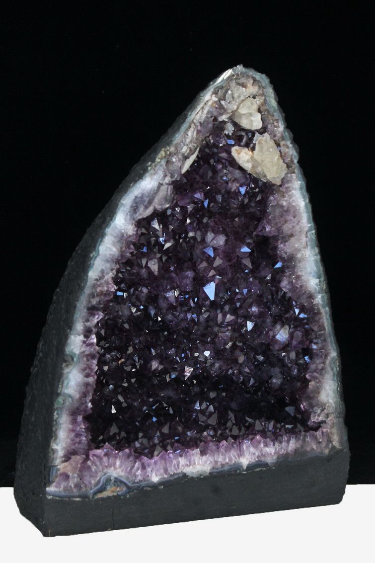 水晶は通常岩石の上に生成されますが、地層や岩の内側に洞窟状にできたものをアメジストドームといいます。アメジストの原石を半分に割り断面を美しく研磨すると、迫力と存在感、そしてエネルギーに満ちた置物に仕上がるのです。