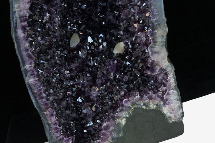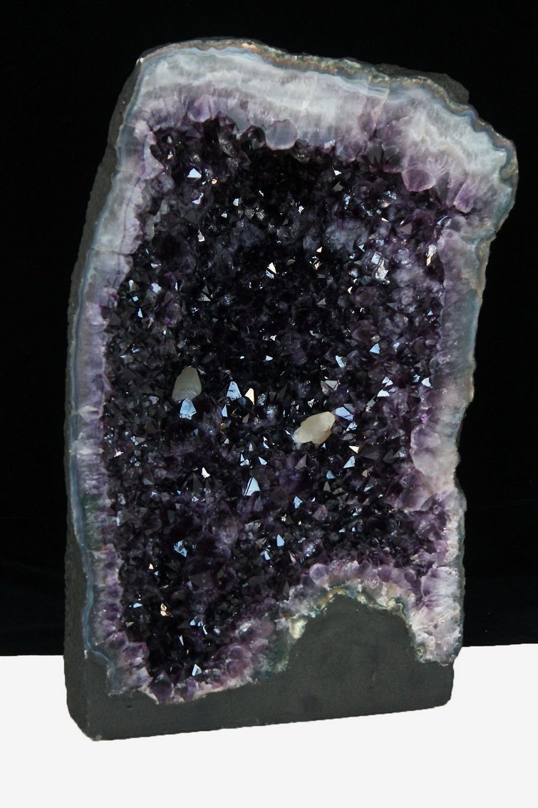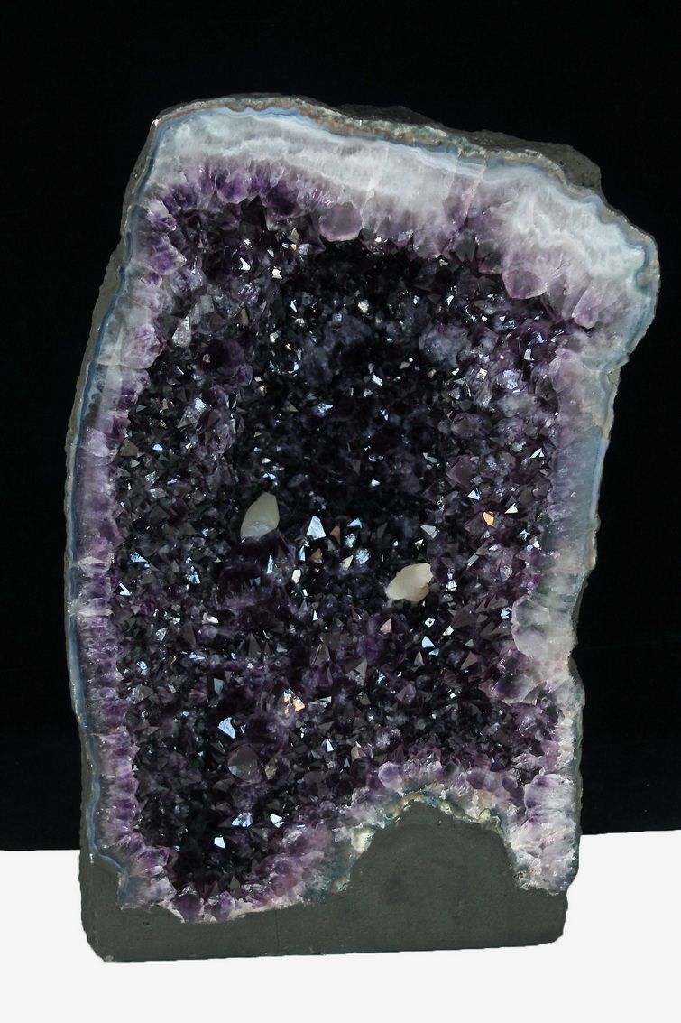 水晶は通常岩石の上に生成されますが、地層や岩の内側に洞窟状にできたものをアメジストドームといいます。アメジストの原石を半分に割り断面を美しく研磨すると、迫力と存在感、そしてエネルギーに満ちた置物に仕上がるのです。