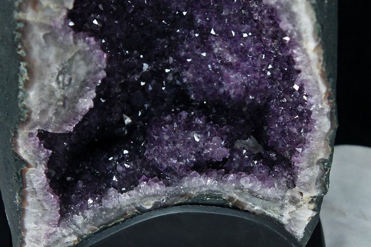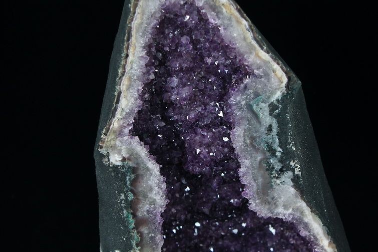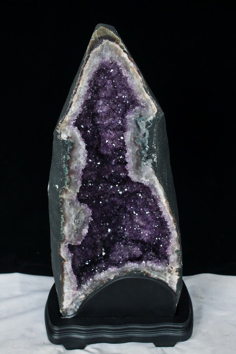 水晶は通常岩石の上に生成されますが、地層や岩の内側に洞窟状にできたものをアメジストドームといいます。アメジストの原石を半分に割り断面を美しく研磨すると、迫力と存在感、そしてエネルギーに満ちた置物に仕上がるのです。