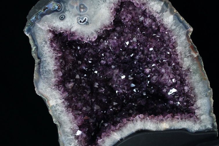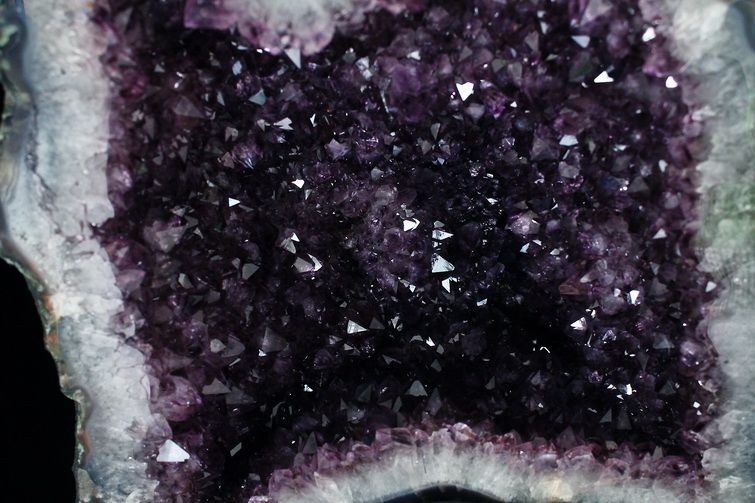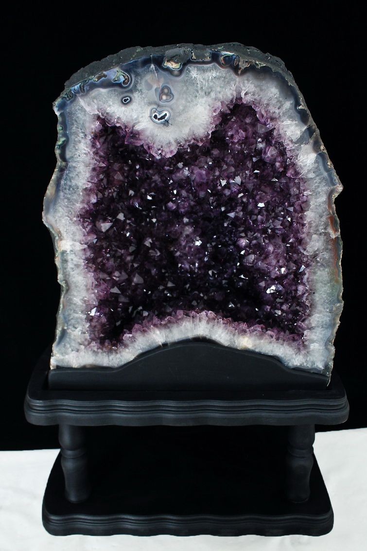 水晶は通常岩石の上に生成されますが、地層や岩の内側に洞窟状にできたものをアメジストドームといいます。アメジストの原石を半分に割り断面を美しく研磨すると、迫力と存在感、そしてエネルギーに満ちた置物に仕上がるのです。