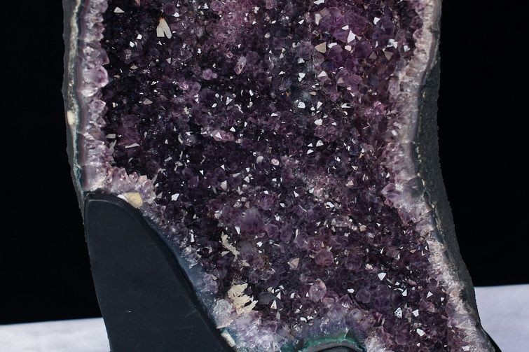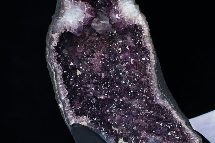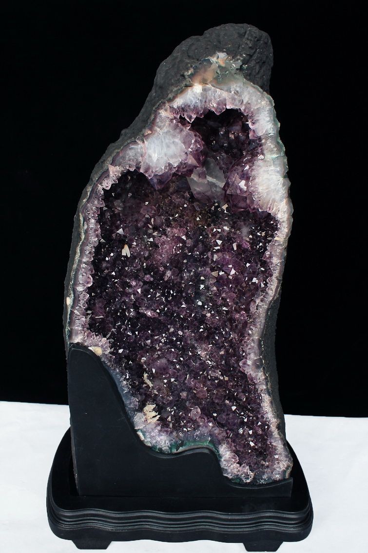 水晶は通常岩石の上に生成されますが、地層や岩の内側に洞窟状にできたものをアメジストドームといいます。アメジストの原石を半分に割り断面を美しく研磨すると、迫力と存在感、そしてエネルギーに満ちた置物に仕上がるのです。