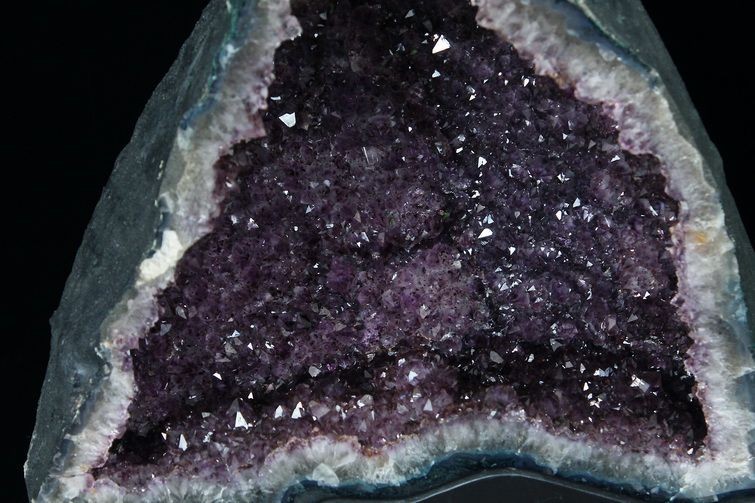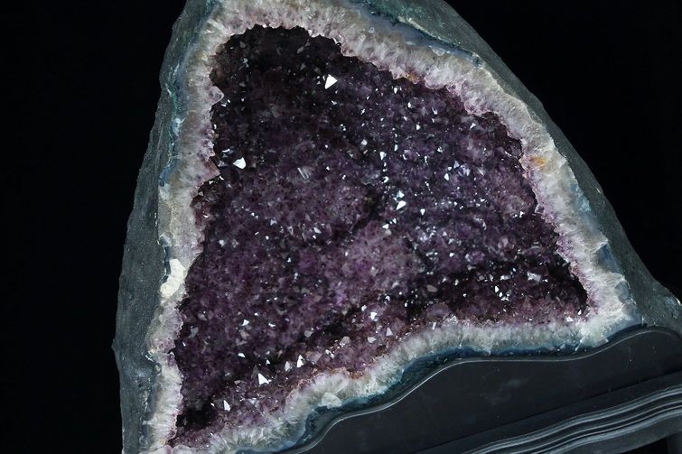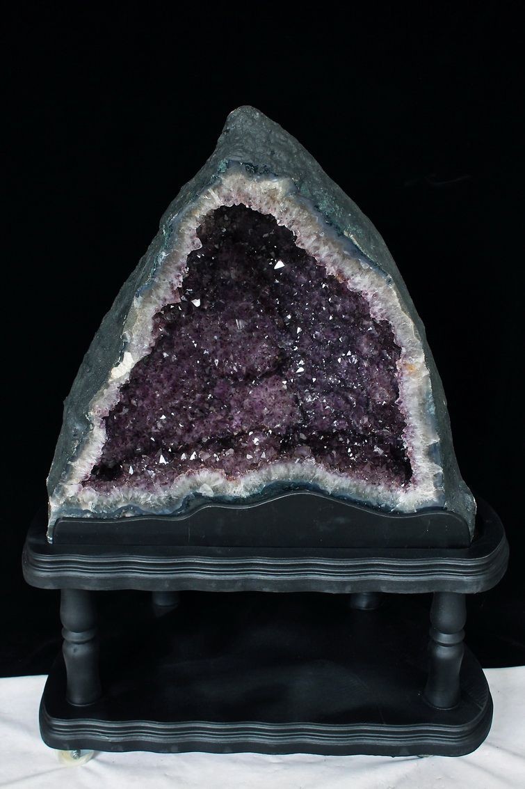 水晶は通常岩石の上に生成されますが、地層や岩の内側に洞窟状にできたものをアメジストドームといいます。アメジストの原石を半分に割り断面を美しく研磨すると、迫力と存在感、そしてエネルギーに満ちた置物に仕上がるのです。