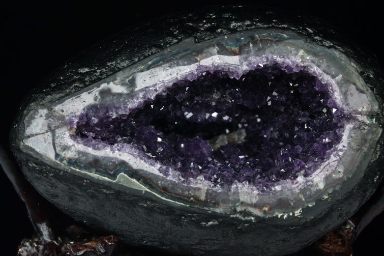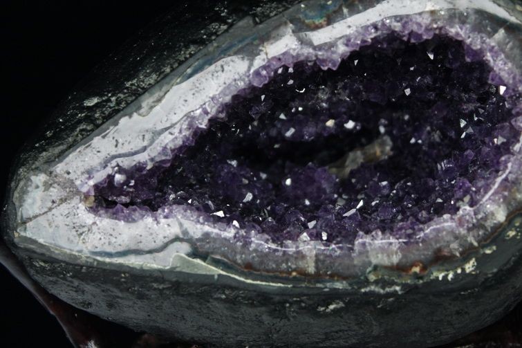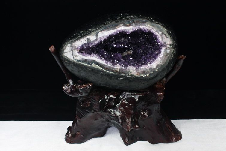 水晶は通常岩石の上に生成されますが、地層や岩の内側に洞窟状にできたものをアメジストドームといいます。アメジストの原石を半分に割り断面を美しく研磨すると、迫力と存在感、そしてエネルギーに満ちた置物に仕上がるのです。