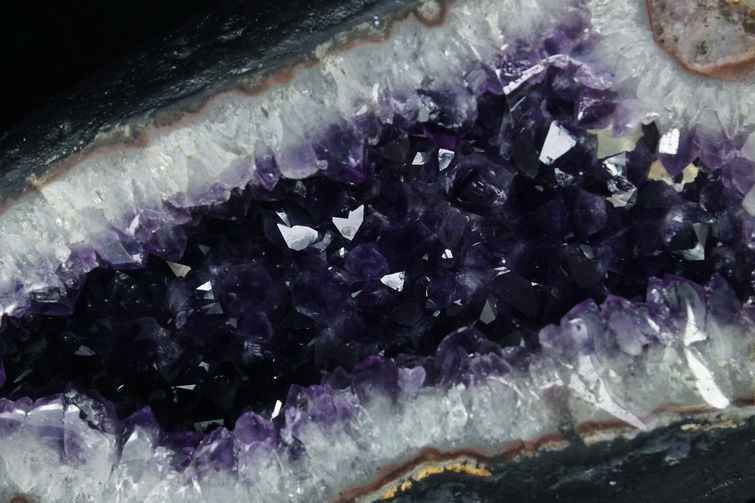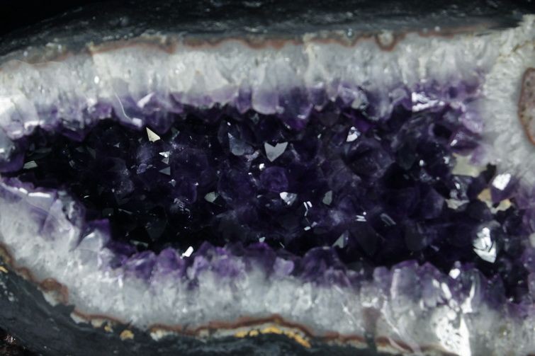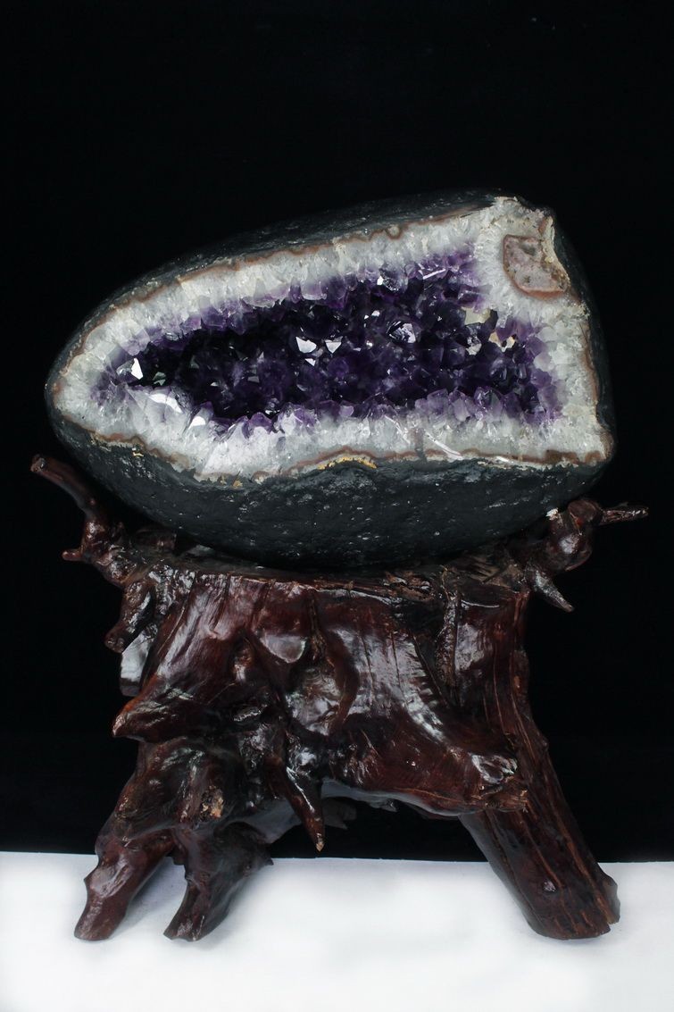 水晶は通常岩石の上に生成されますが、地層や岩の内側に洞窟状にできたものをアメジストドームといいます。アメジストの原石を半分に割り断面を美しく研磨すると、迫力と存在感、そしてエネルギーに満ちた置物に仕上がるのです。