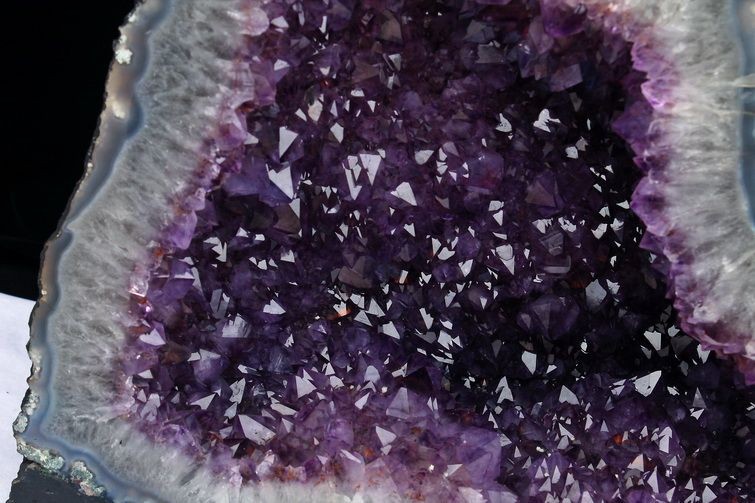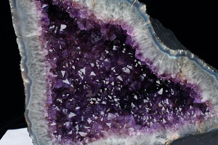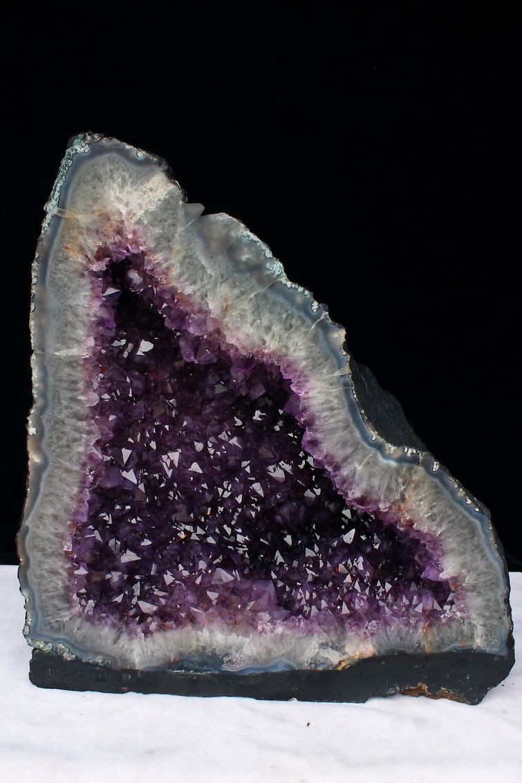 水晶は通常岩石の上に生成されますが、地層や岩の内側に洞窟状にできたものをアメジストドームといいます。アメジストの原石を半分に割り断面を美しく研磨すると、迫力と存在感、そしてエネルギーに満ちた置物に仕上がるのです。