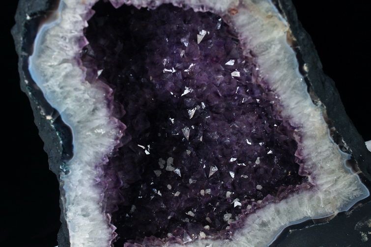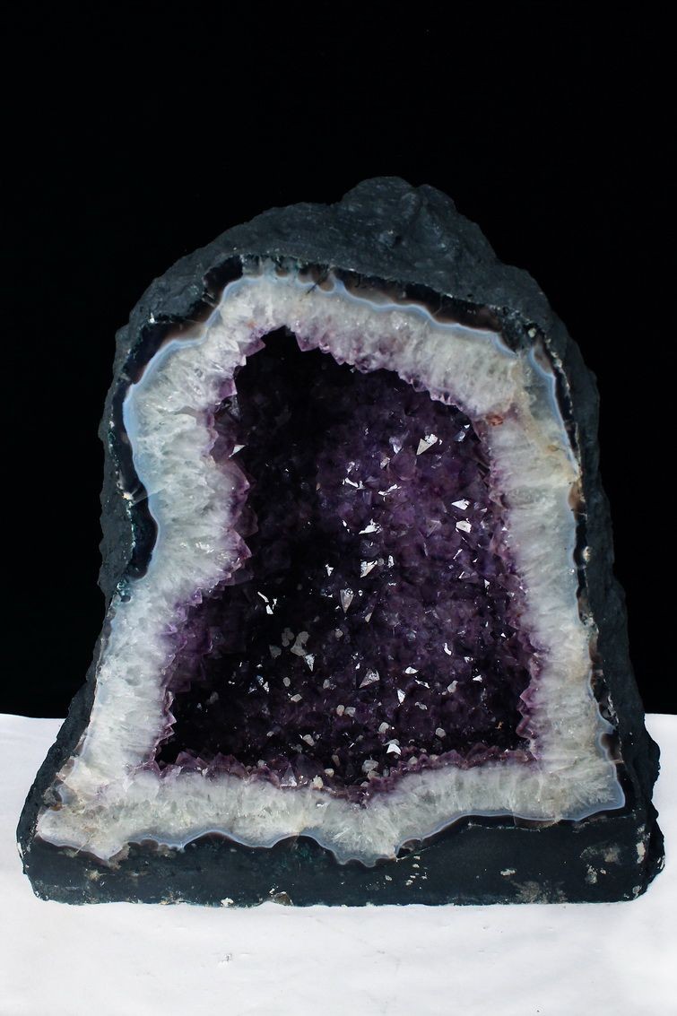 水晶は通常岩石の上に生成されますが、地層や岩の内側に洞窟状にできたものをアメジストドームといいます。アメジストの原石を半分に割り断面を美しく研磨すると、迫力と存在感、そしてエネルギーに満ちた置物に仕上がるのです。
