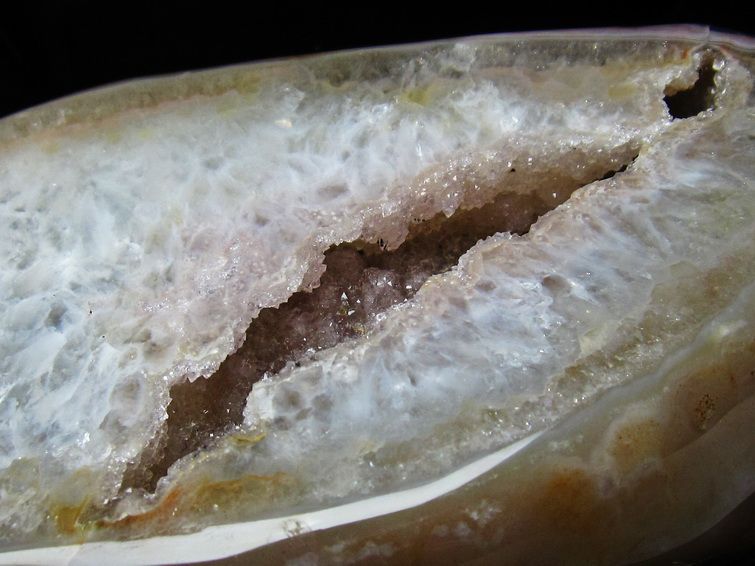 トレジャーメノウは、メノウの原石の中に壁面が水晶の結晶でできた空洞があるものをいいます。それを割ったら、まるで宝箱に宝物がザクザク入っているのを想像させることから、トレジャーメノウという名前が付けられました。