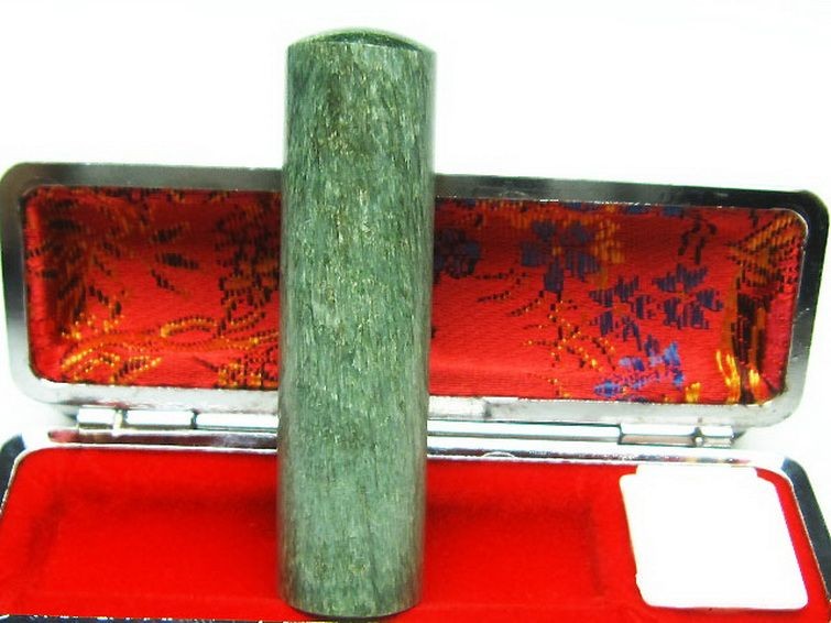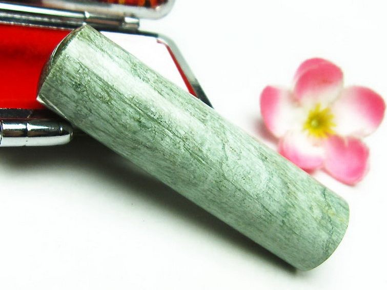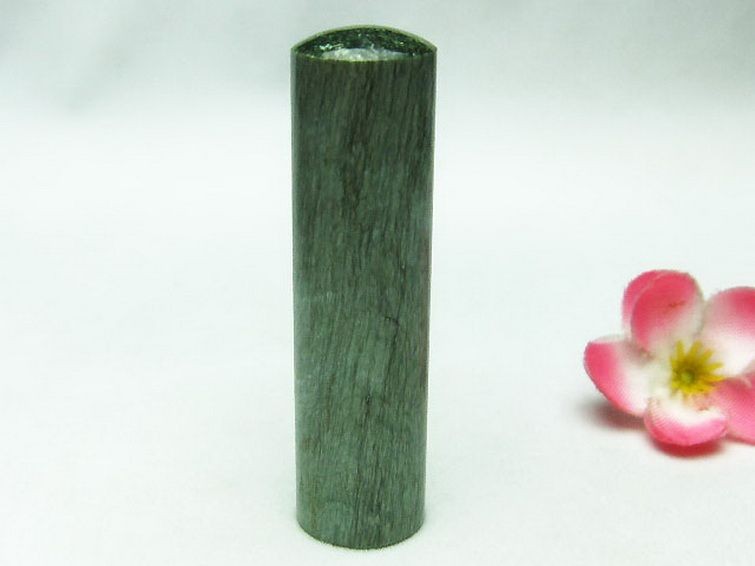 研磨すると深い緑色の中に白色~銀色の絹糸模様をみせるのが特徴で、この模様は「フェザーインクルージョン」と呼ばれます。