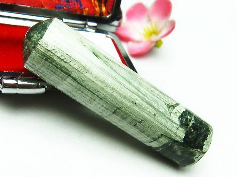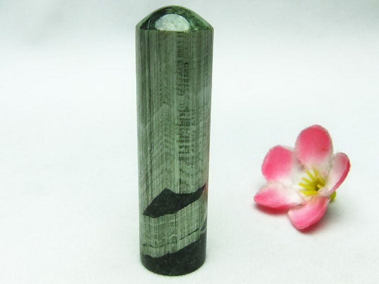 研磨すると深い緑色の中に白色~銀色の絹糸模様をみせるのが特徴で、この模様は「フェザーインクルージョン」と呼ばれます。