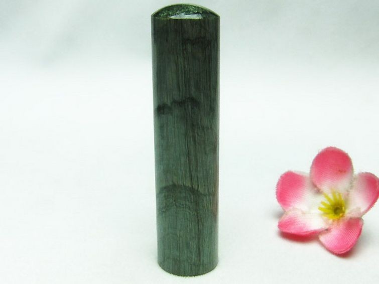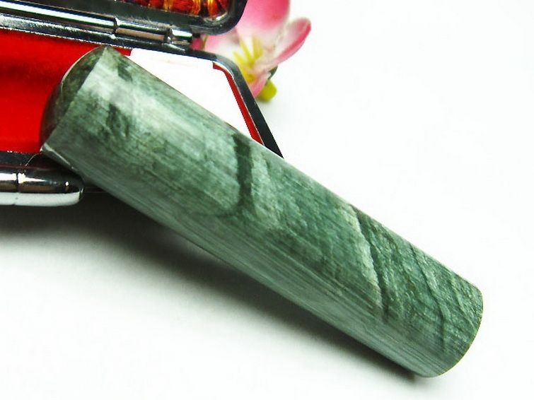 研磨すると深い緑色の中に白色~銀色の絹糸模様をみせるのが特徴で、この模様は「フェザーインクルージョン」と呼ばれます。