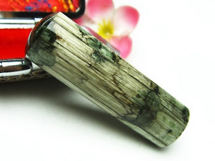 研磨すると深い緑色の中に白色~銀色の絹糸模様をみせるのが特徴で、この模様は「フェザーインクルージョン」と呼ばれます。