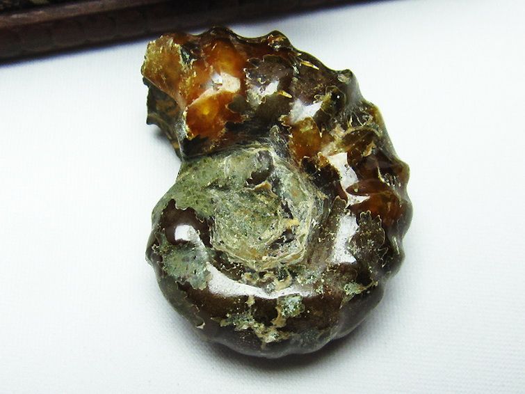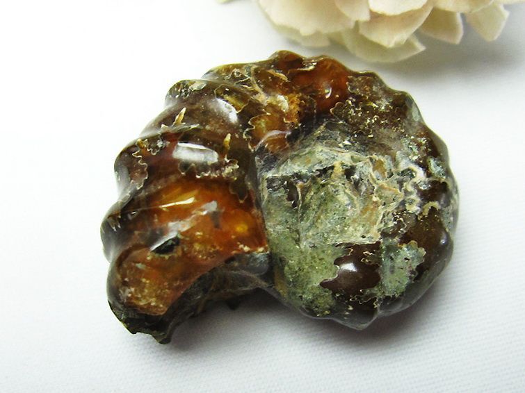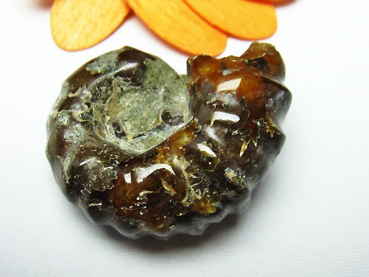 個体差にもよりますが、アンモナイトは燃えるような紅色、紫色の遊色を持つものもあり、そのような個体は表面を綺麗に研磨することで虹色に輝く遊色効果が見られ美麗です。
