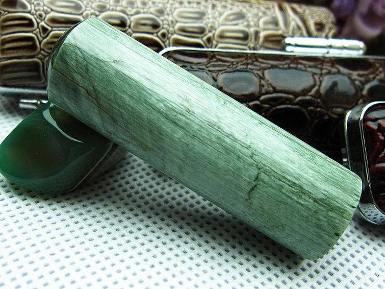 研磨すると深い緑色の中に白色~銀色の絹糸模様をみせるのが特徴で、この模様は「フェザーインクルージョン」と呼ばれます。