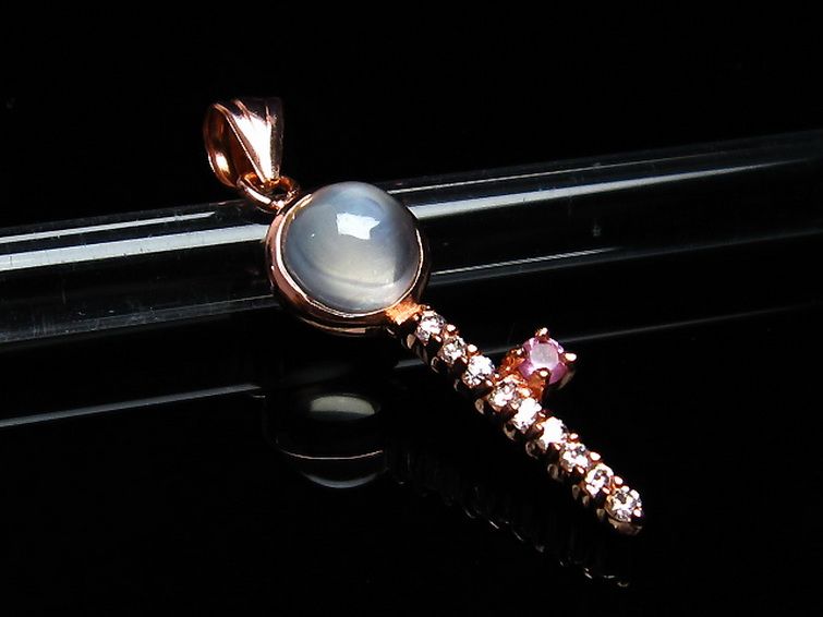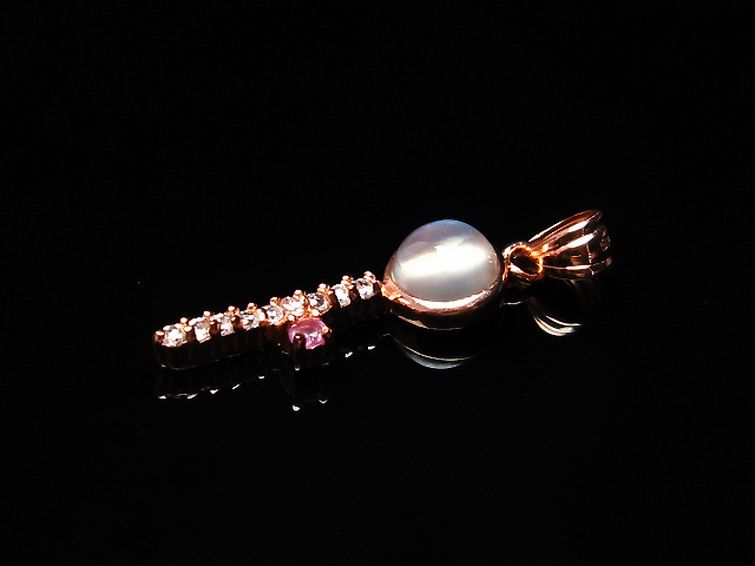 ムーンストーンは長石の一種で正長石(オーソクレース)を主としアルバイト(曹長石)成分を含んでいます。そのために美しいシラー効果が確認できます。乳白色や半透明のものが一般的ですが、他にも青やオレンジ等の様々な色が確認されています。柔らかい月の明かりのような光沢を持ち、真珠を思わせるような上品な石です。