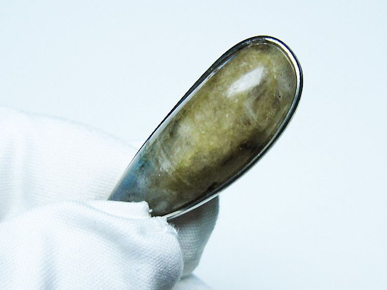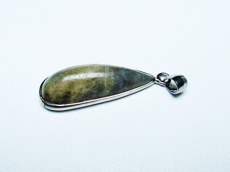 【ラブラドライト(曹灰長石)】 フェルドスパー(長石)の系列の斜長石の一種。灰褐色や黒っぽい色をしていますが光が反射することにより、独特の虹効果、ラブラドレッセンスが確認できます。鮮やかな色で蝶の羽のような光沢を持ち、宇宙の暗闇に光る銀河を連想させます。