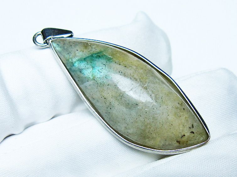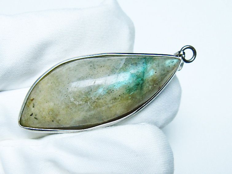 【ラブラドライト(曹灰長石)】 フェルドスパー(長石)の系列の斜長石の一種。灰褐色や黒っぽい色をしていますが光が反射することにより、独特の虹効果、ラブラドレッセンスが確認できます。鮮やかな色で蝶の羽のような光沢を持ち、宇宙の暗闇に光る銀河を連想させます。