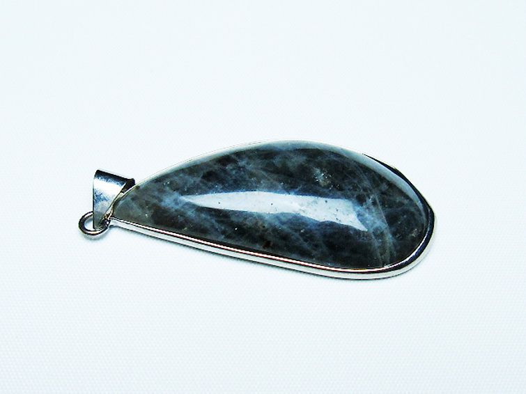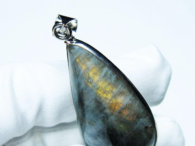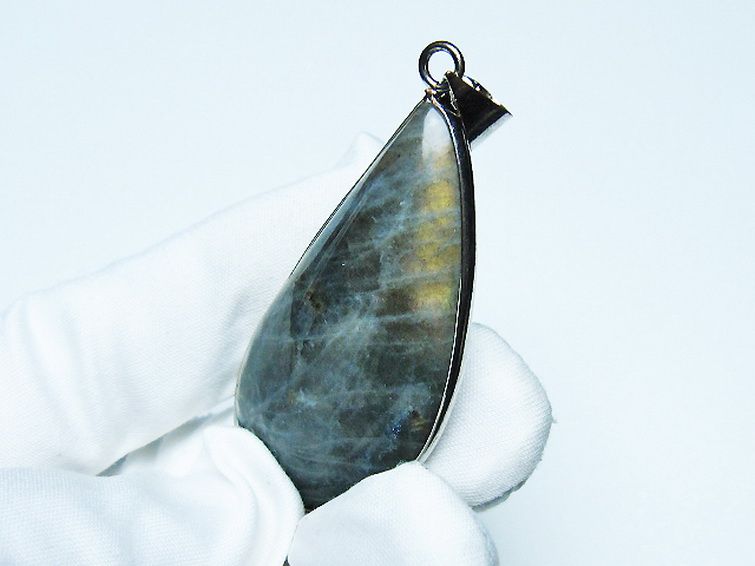 【ラブラドライト(曹灰長石)】 フェルドスパー(長石)の系列の斜長石の一種。灰褐色や黒っぽい色をしていますが光が反射することにより、独特の虹効果、ラブラドレッセンスが確認できます。鮮やかな色で蝶の羽のような光沢を持ち、宇宙の暗闇に光る銀河を連想させます。