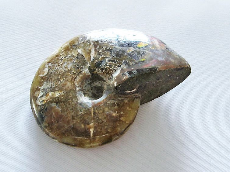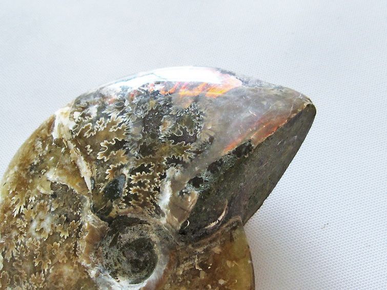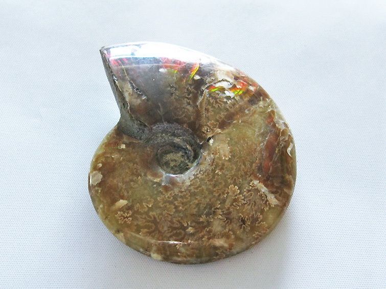 個体差にもよりますが、アンモナイトは燃えるような紅色、紫色の遊色を持つものもあり、そのような個体は表面を綺麗に研磨することで虹色に輝く遊色効果が見られ美麗です。