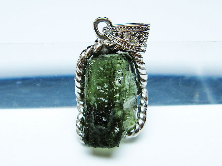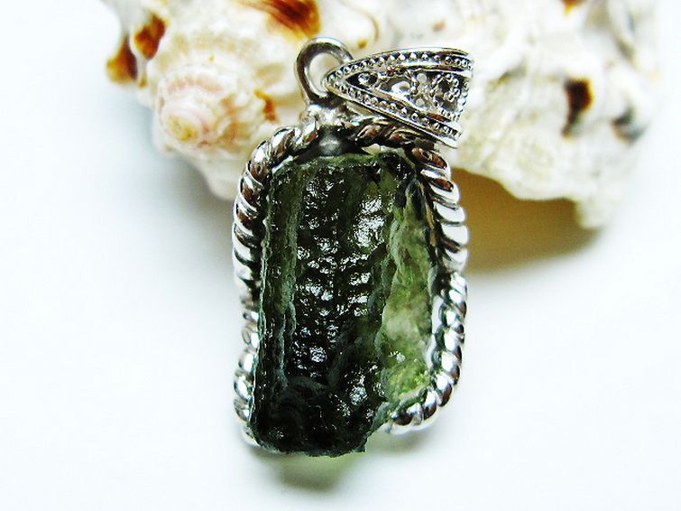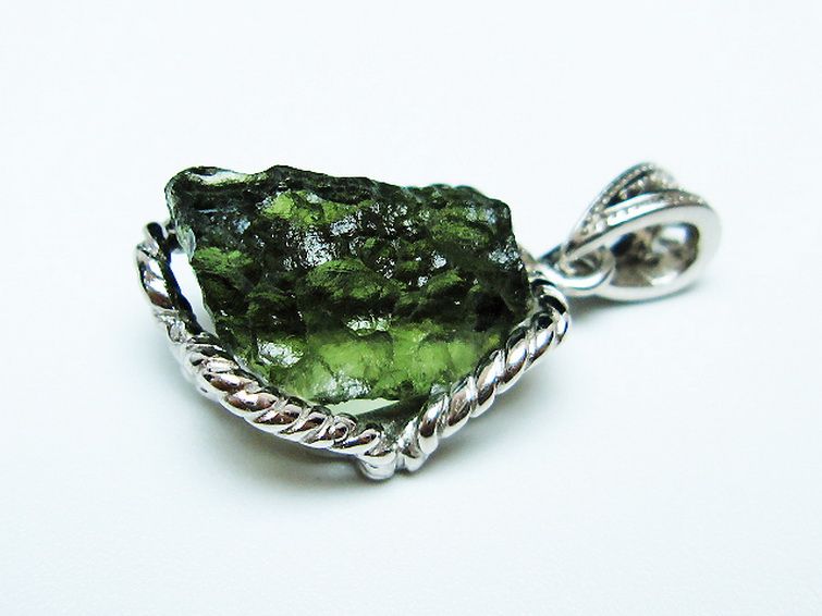 モルダバイトは隕石が落下した際にできたと考えられるガラス質の結晶でテクタイトの一種です。旧チェコスロバキアのモルダウ川付近から最初に発見されました。透き通った独特の緑が宇宙の神秘を想像させてくれます。