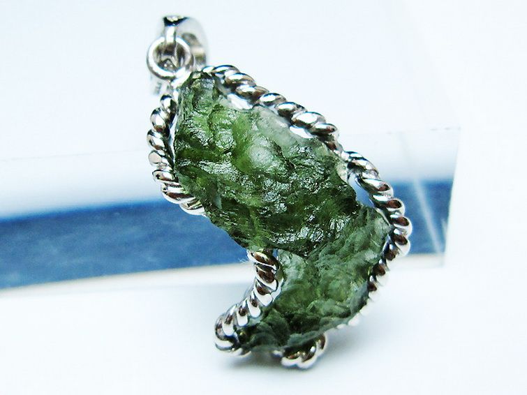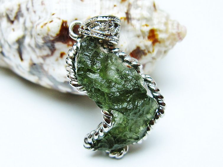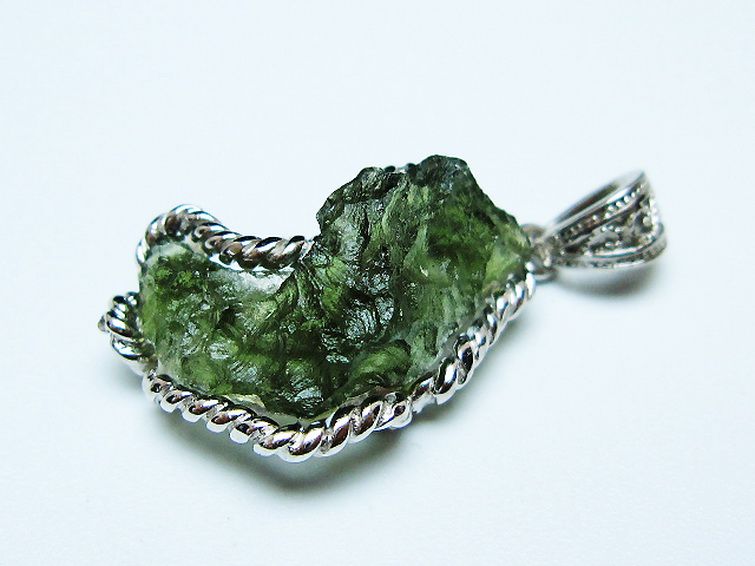 モルダバイトは隕石が落下した際にできたと考えられるガラス質の結晶でテクタイトの一種です。旧チェコスロバキアのモルダウ川付近から最初に発見されました。透き通った独特の緑が宇宙の神秘を想像させてくれます。