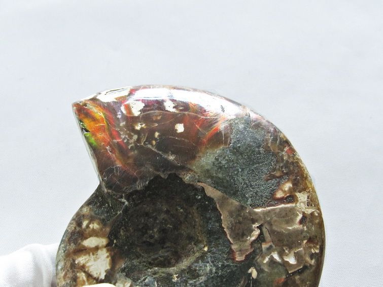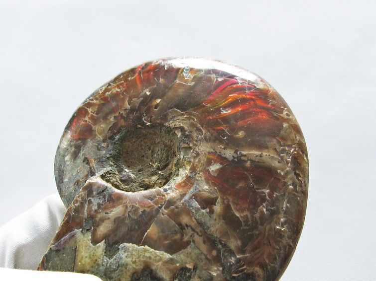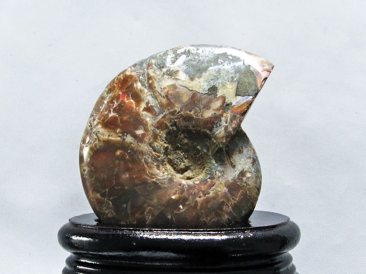 個体差にもよりますが、アンモナイトは燃えるような紅色、紫色の遊色を持つものもあり、そのような個体は表面を綺麗に研磨することで虹色に輝く遊色効果が見られ美麗です。