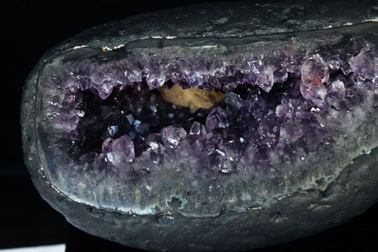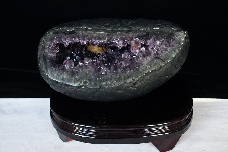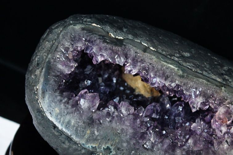 水晶は通常岩石の上に生成されますが、地層や岩の内側に洞窟状にできたものをアメジストドームといいます。アメジストの原石を半分に割り断面を美しく研磨すると、迫力と存在感、そしてエネルギーに満ちた置物に仕上がるのです。