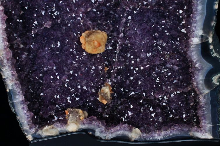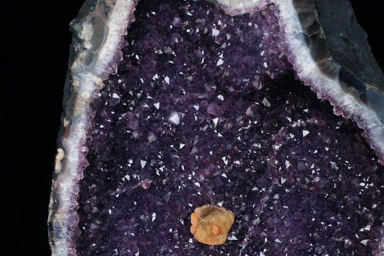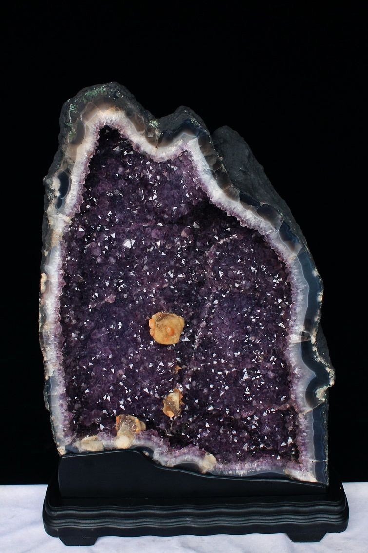 水晶は通常岩石の上に生成されますが、地層や岩の内側に洞窟状にできたものをアメジストドームといいます。アメジストの原石を半分に割り断面を美しく研磨すると、迫力と存在感、そしてエネルギーに満ちた置物に仕上がるのです。