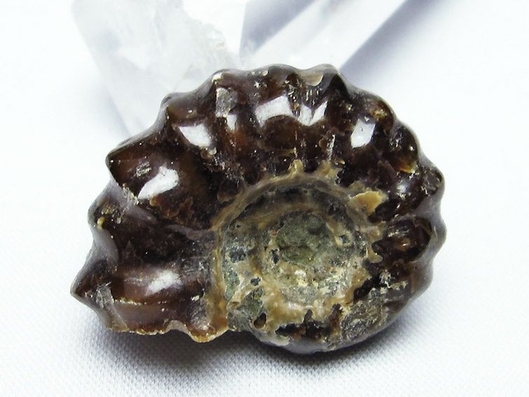 個体差にもよりますが、アンモナイトは燃えるような紅色、紫色の遊色を持つものもあり、そのような個体は表面を綺麗に研磨することで虹色に輝く遊色効果が見られ美麗です。